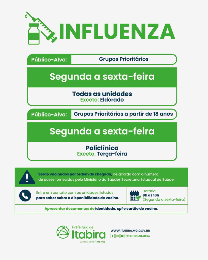 #PrefeituraDeItabira #SaúdeItabira #VacinaItabira #Influenza #Gripe #VacinaSalvaVidas #SUS